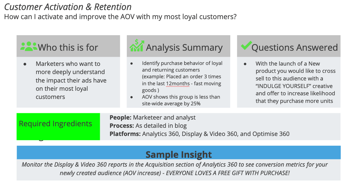 4: In Display & Video 360, create a remarketing campaign, targeted to the ‘3 Orders-12 Months-Low AOV’ audience, with creatives that feature the message: “Indulge yourself: free travel size Product X when you spend £30 or more”.