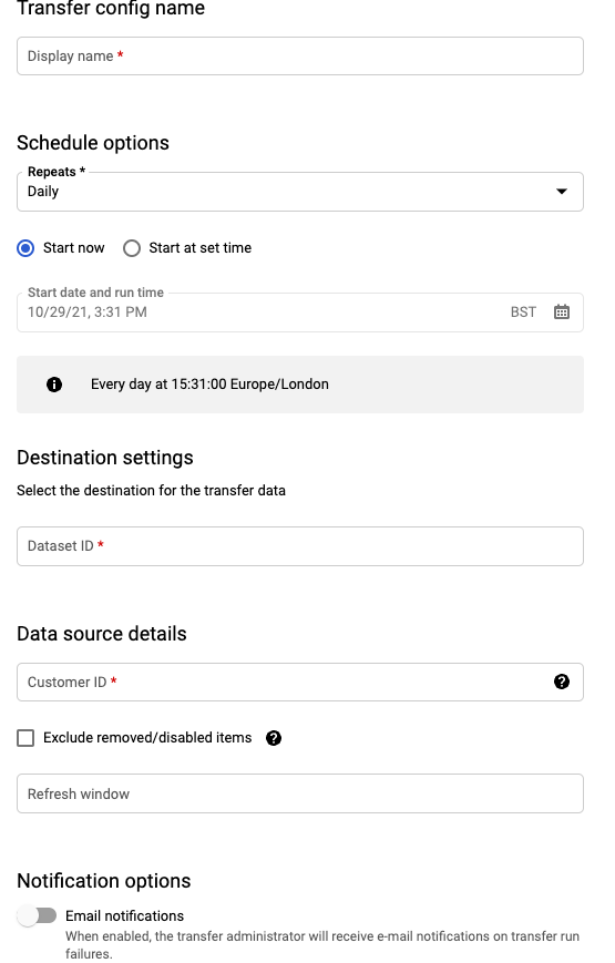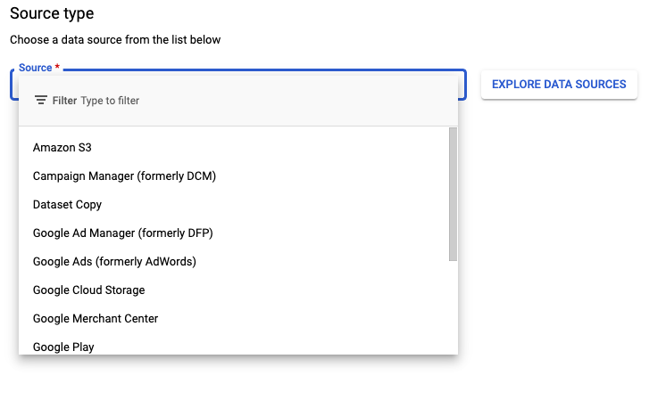 The BigQuery Data Transfer Service is a tool the GCP provides to automate data movement into BigQuery on a scheduled, managed basis without having to write any custom code. The supported data sources include YouTube, Google Play, Google Ads and many other Google and 3rd party tools.