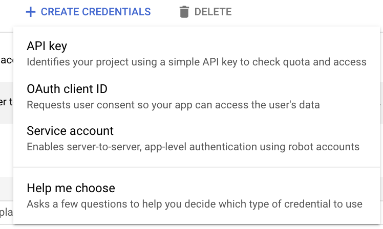 Once you’re on the Credentials page, click on the top menu bar on “Create Credentials”, and then click on “Help me choose”.