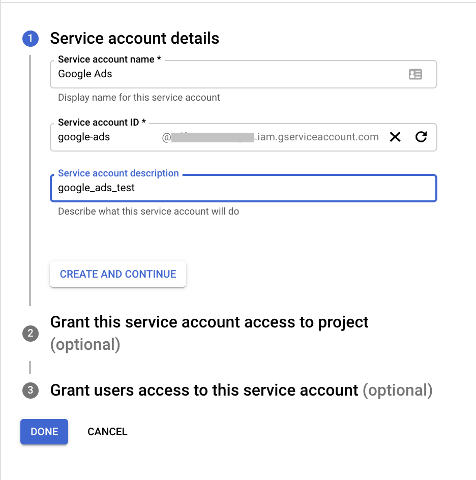 After you click done, you’ll need to create the name and the ID of the service account and click done.