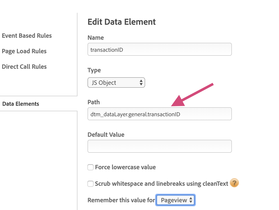 First things first, you need to create the data elements that will capture the dataLayer values you want to use to form your ecommerce purchase object. Data elements are the equivalent of variables in GTM, therefore you can create them once and use them as many times you need, which improves the efficiency of your tagging process. Below there’s example of how you can create a data element to capture the transaction ID from the dataLayer: