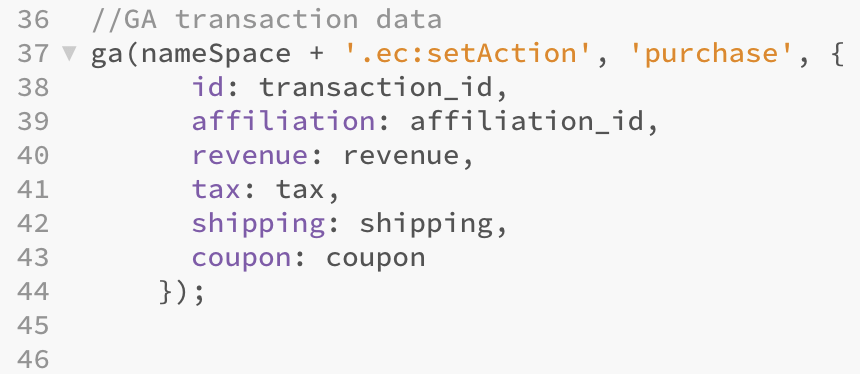 In this JavaScript tag, you will create variables that will be referencing the data elements created in the first step. To reference data elements in a custom tag in DTM you can use the following taxonomy: _satellite.getVar('Your data element name'). You will then use all these variables to build your ecommerce object which will be sending data to GA. Here’s a screenshot of how this might look like: