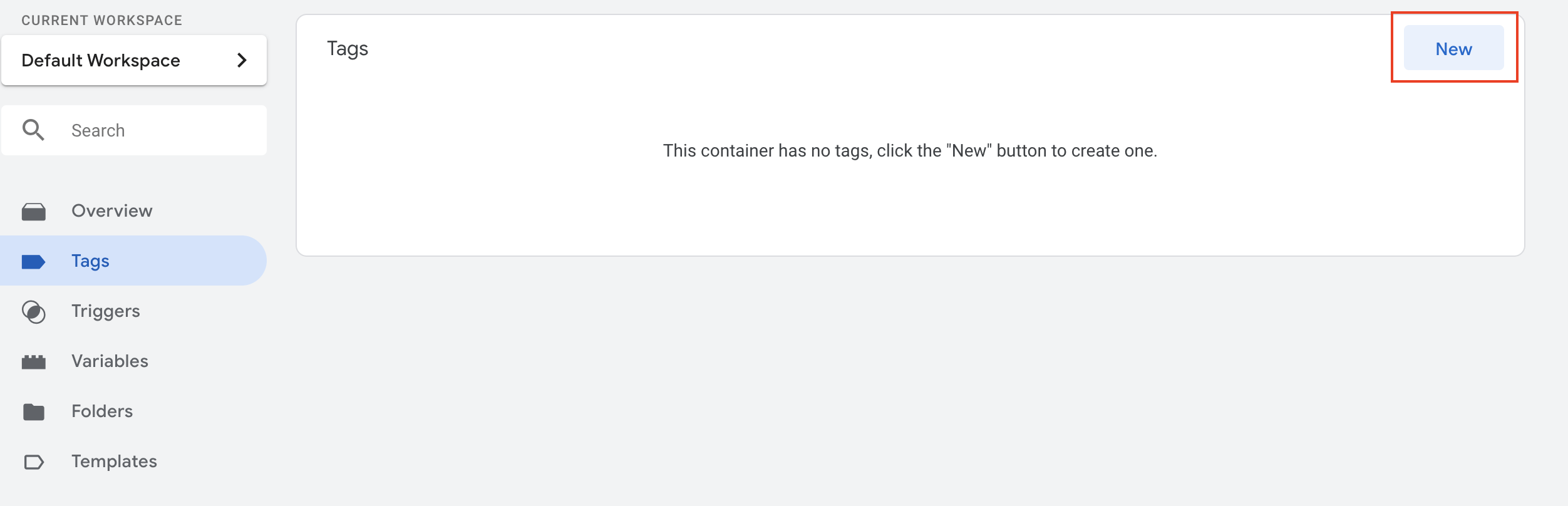 We're going to set up a Google Analytics pageview tag. This replaces the old hardcoded GA that you'd used to have to put on every page of the site. We start by going to tags and selecting the "New" button in the top-right.