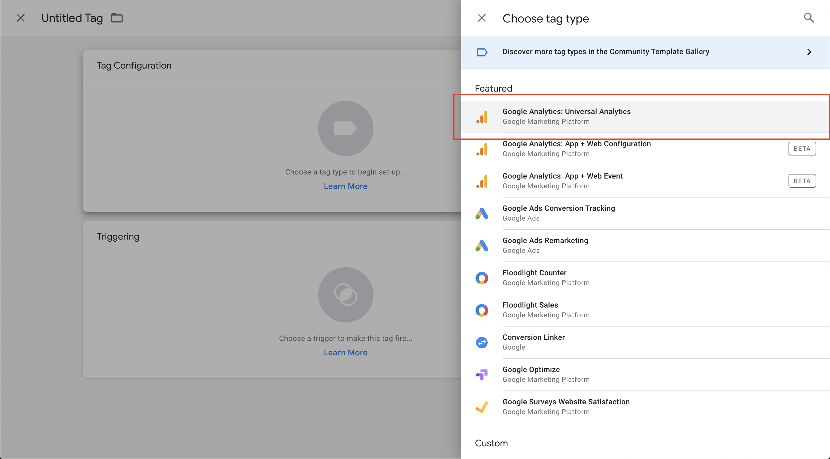 Select Universal Analytics from the list, because that's the tag template we're using here: