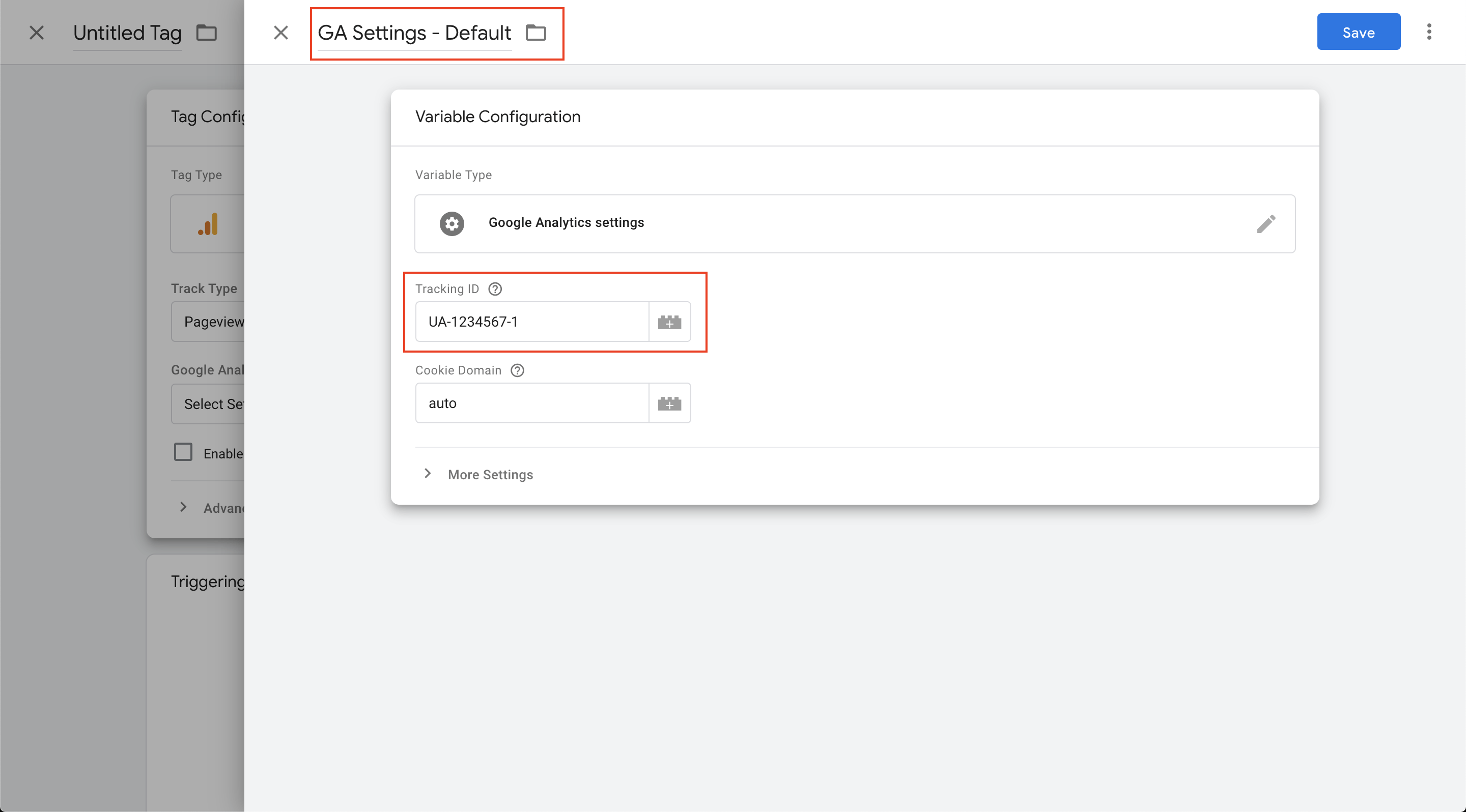 This highlights something quite important about GTM—you can do things in several different ways. If I'd thought ahead, I could've created my GA settings variable beforehand, but since I didn't I can create it 'on the fly' while making my tag, without having to back out of the tag creation interface. Here, I'm going to add my tracking ID (not real) and give my variable a name. We'll leave Cookie Domain set to auto:
