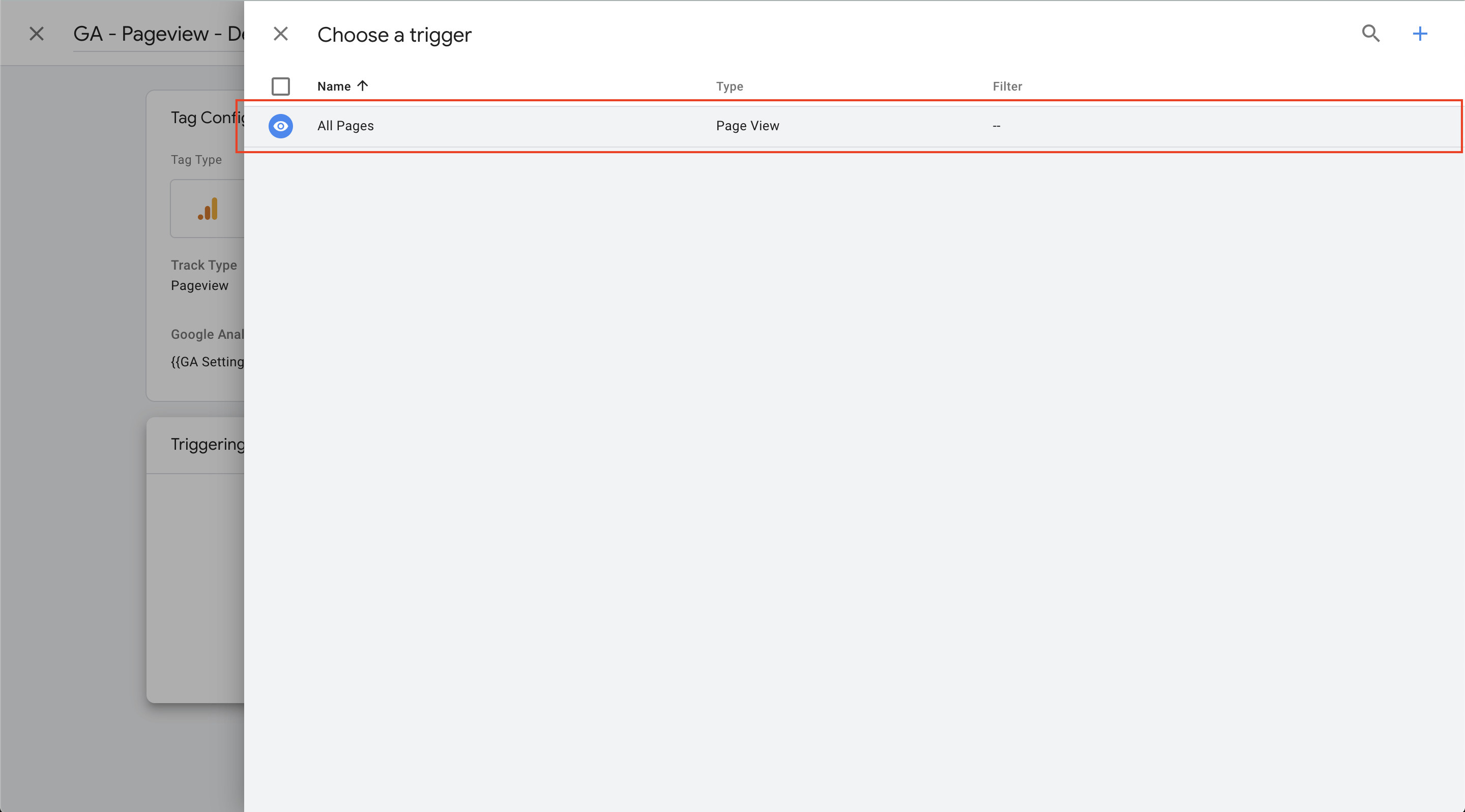 There's only one built-in trigger in GTM, but fortunately that's the one we want—All Pages; as this is replacing the GA code we'd put on all pages to fire: