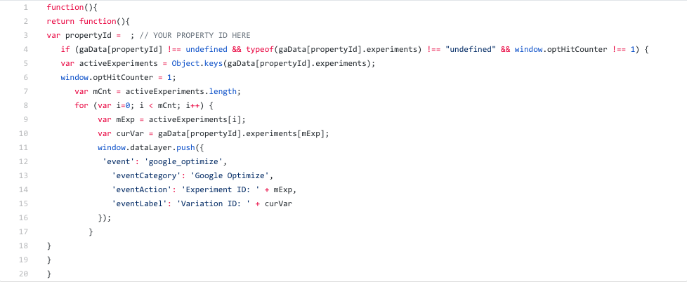 Here, we've got a bit of code that you'll want to set up as a custom JS variable, to set as hitCallback in the custom fields to set on your default GA pageview, as we want it to run after GA's available and any pageview hits are being sent. It checks to see if there are any Optimize experiments being run, then pushes to the data layer the ID and variations of any that are being run. Unfortunately there's no "human-readable" name available on the page as there is with Optimizely, but if you really want it to be readable in the GA interface, you can set up a lookup table or something to get the name from the experiment ID.