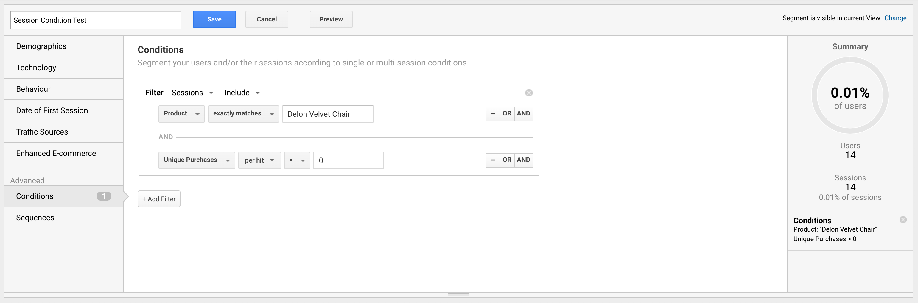 Which looks sensible, however, it is very misleading. This will include sessions where a product name exactly matching “Delon Velvet Chair” was included in a hit and in the same session, the unique purchases per hit is greater > 0. However, what it does not specify is that the hit the product name appeared in was the same hit as the purchase occurred. So, it’s entirely possible that this session involved the user viewing the “Delon Velvet Chair” product page (or that product appearing in a product list they viewed), but purchasing an entirely different product.