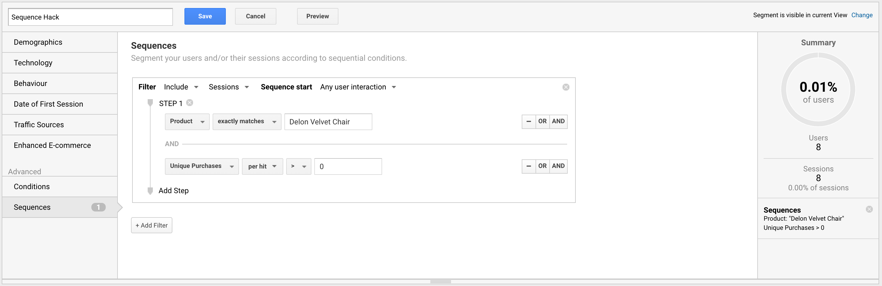 To ensure that we only include sessions where the Delon Velvet Chair was purchased, we need to force the segment to tie the product name criteria to the unique purchase criteria in the same hit. This is where the hack comes into play.