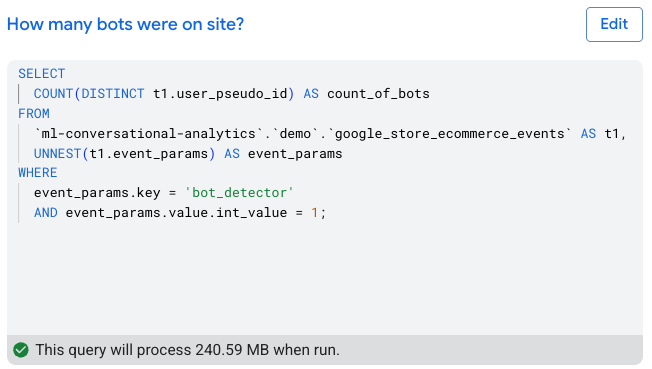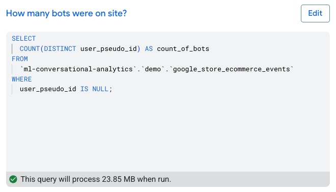 In our second example, we simply asked NL2SQL to show how many bots were on site. The immediate output was nonsensical - the SQL generated counts the number of unique user_pseudo_ids where user_pseudo_ids is NULL…