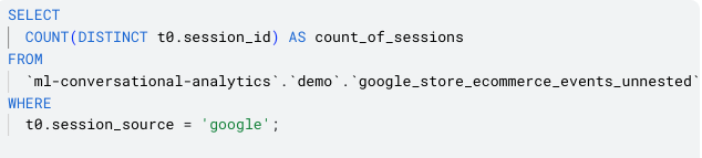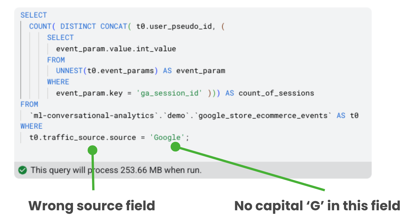 The NL-SQL produced a query that, on first inspection, looked perfect. It counted distinct combinations of user pseudo ID and session ID, filtered by source. Textbook stuff. But look closer and you'll spot two problems. First, it used traffic_source.source instead of the session-scoped source from event parameters or the newer session_traffic_source_last_click.manual_campaign.source field, a subtle but important distinction in attribution. Second, it filtered for "Google" with a capital G, while the actual data uses lowercase.